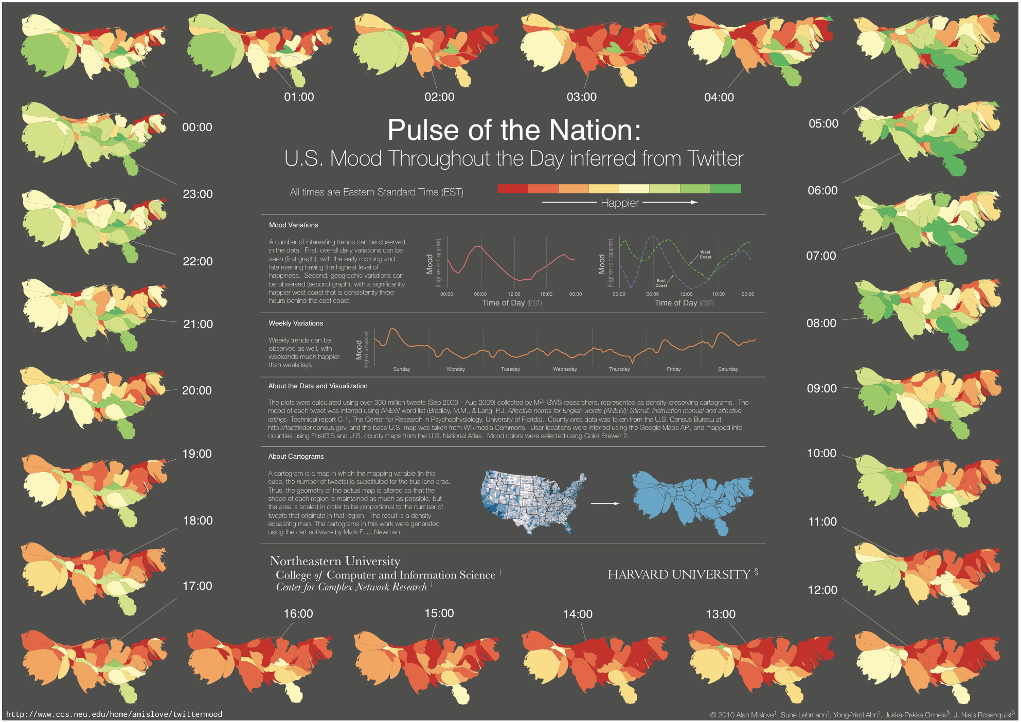 I’ve always been fascinated by infographics, and I’ve really been into research that tries to calculate people’s emotions. This infograph is pretty amazing. It’s taken all the twitters coming out from the US (around 300 million of them), and calculated emotional words people used in their updates to build a map of emotion. Looks like California is the happiest place in the country- but come working hours no one’s happy :-( There’s also video of the map here.